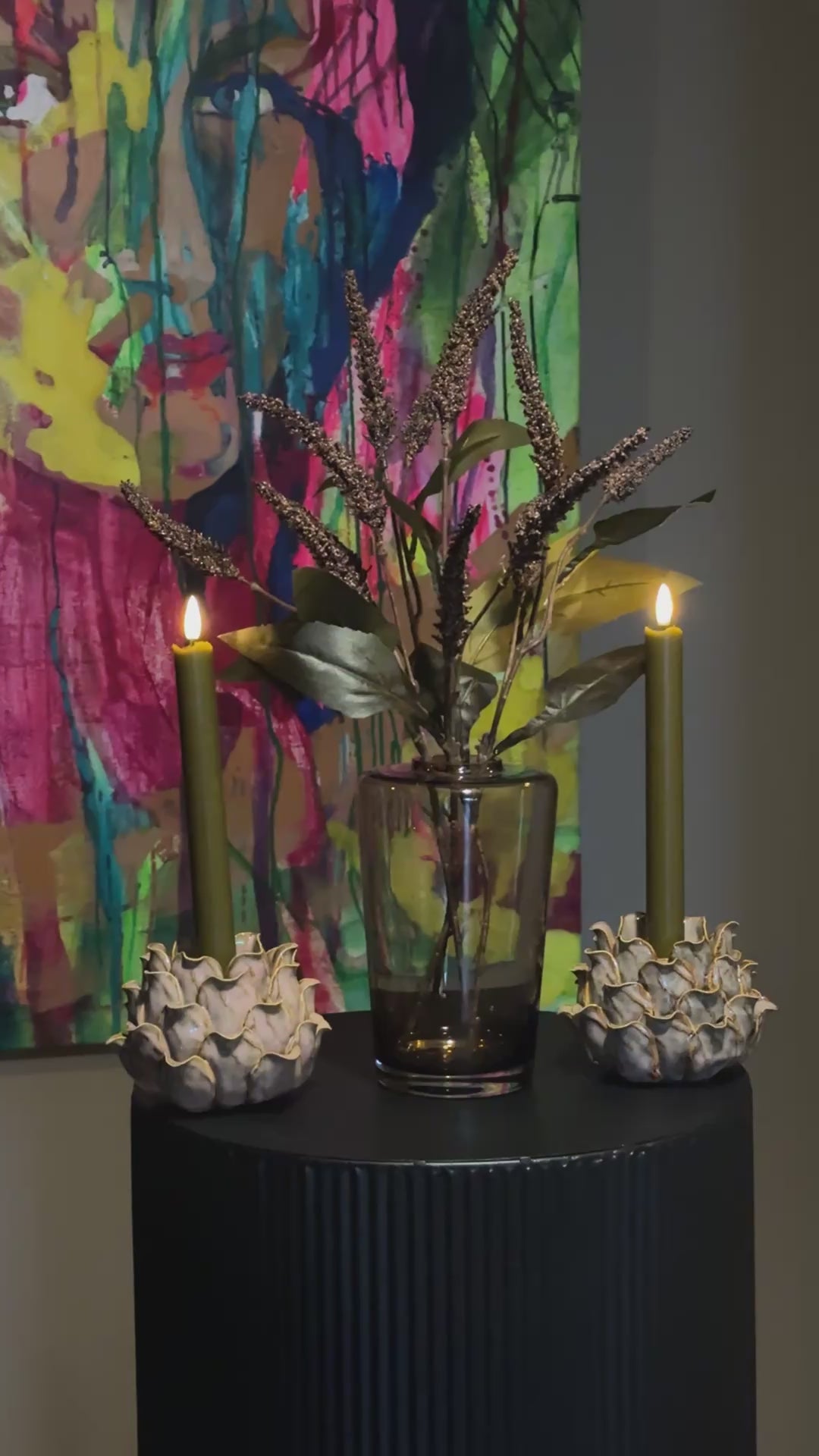 Prachtige decoratieset voor in het toilet vanwege een diepte van 14 cm. Perfect voor een smalle plank (minimaal 15 cm diepte nodig). De set bestaat uit alles dat je op de foto ziet: kaarshouders, led kaarsen, vaas en kunsttakken.